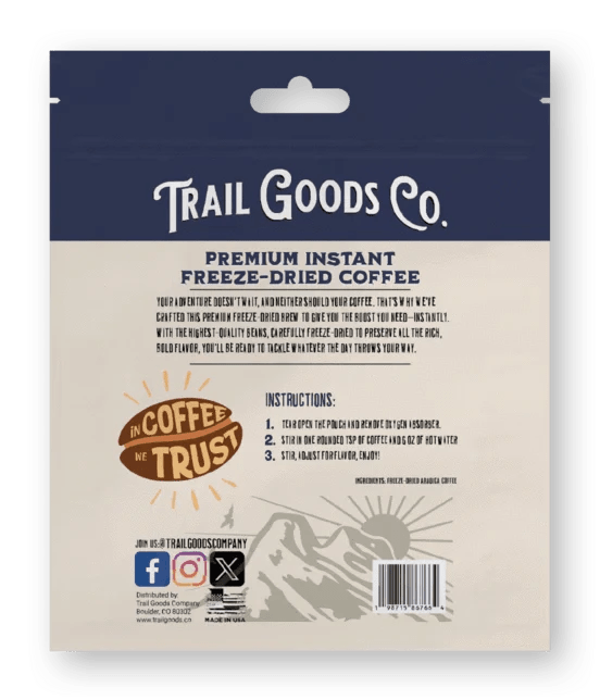 When you're out in the wild, every moment counts. Trail Goods Co. Premium 100% Colombian Freeze-Dried Instant Coffee is made for adventurers who don’t have time to fuss with brewing but refuse to compromise on quality. Just add hot water, stir, and enjoy a bold, smooth cup of premium Colombian coffee—anywhere, anytime.