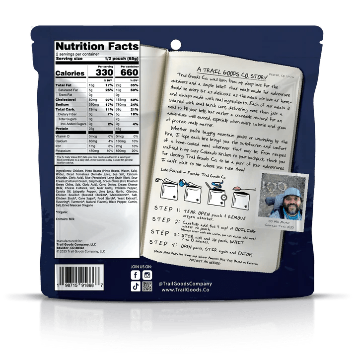 Whether you're enjoying it as a quick, satisfying lunch or a comforting dinner, our Chicken Chile Verde offers a delightful culinary experience that transports you to the heart of Southwestern flavors. For an added twist add this meal to a tortilla and enjoy as a trail burrito.